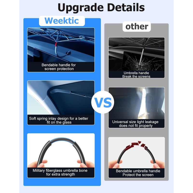 - [Military Grade Frame and Fabric] Weektic windshield sun shade is constructed with thickened high-strength fiberglass ribs that can withstand pressures up to 2500 MPa, with high toughness and resilience to ensure unique durability and protection.240T high-density fabric ensures superior tear resistance and longevity.