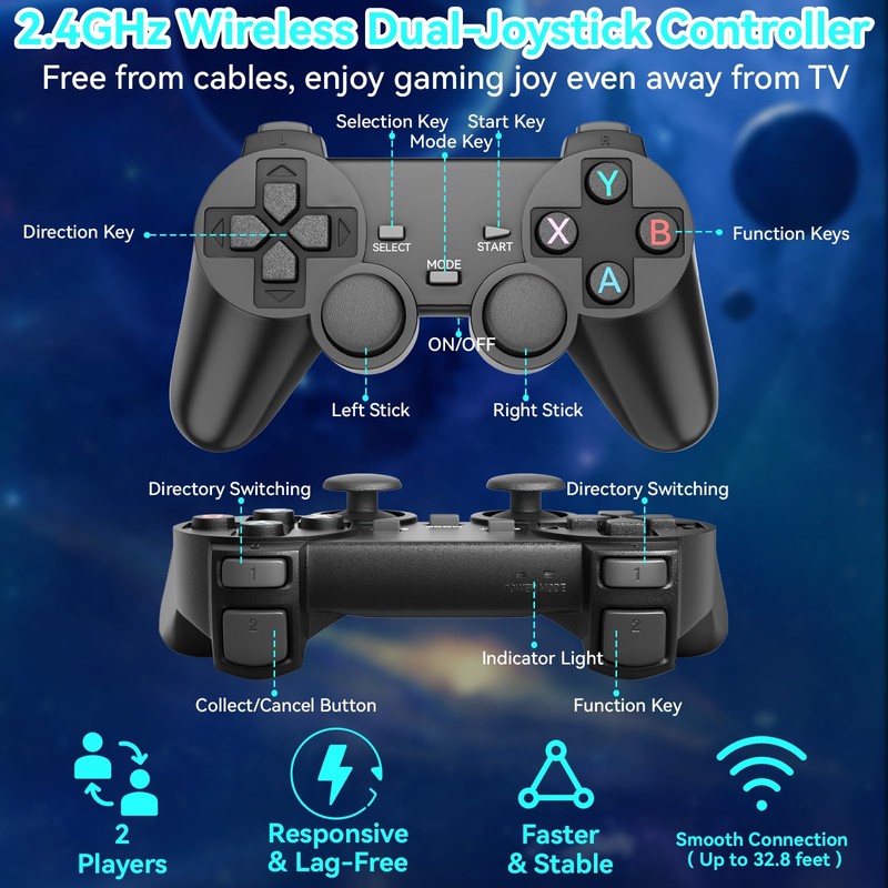 - 【Dual 2.4GHz Wireless Controllers】The retro game console is equipped with 2 sensitive 2.4GHz wireless controllers for a stable, lag-free gaming experience. Get rid of the tangled wires, you can walk around freely. The retro stick supports two-player gaming, so you can enjoy gaming time with friends and family. (Note: Controller requires 2 AAA batteries, not included.)