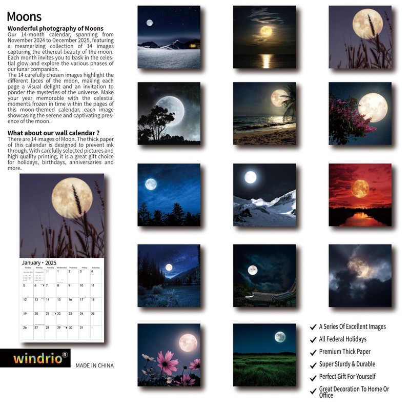 - WONDERFUL PHOTOGRAPHY OF MOONS : This November 2024 - December 2025 wall calendar filled with 14 high resolution, professionally captured images of breathtaking MOON from different camera perspectives. Those photography are perfect for anyone who loves large, bright MOON. The moon is a symbol of beauty and eternity. The beautiful bright moon brings peace and tranquility to people, creating a quiet and beautiful artistic conception.