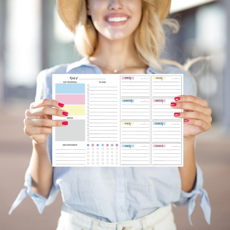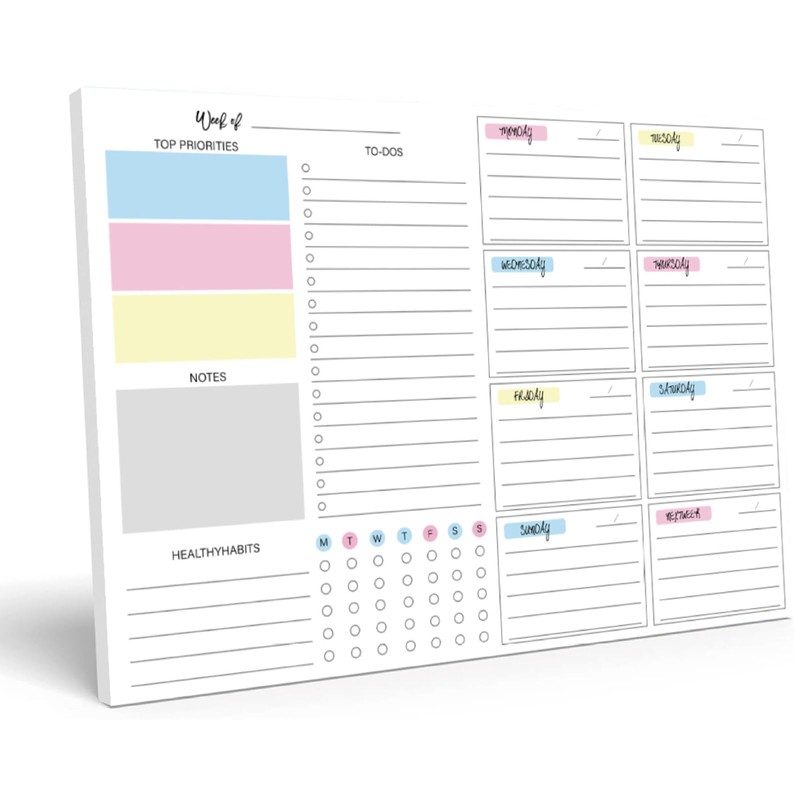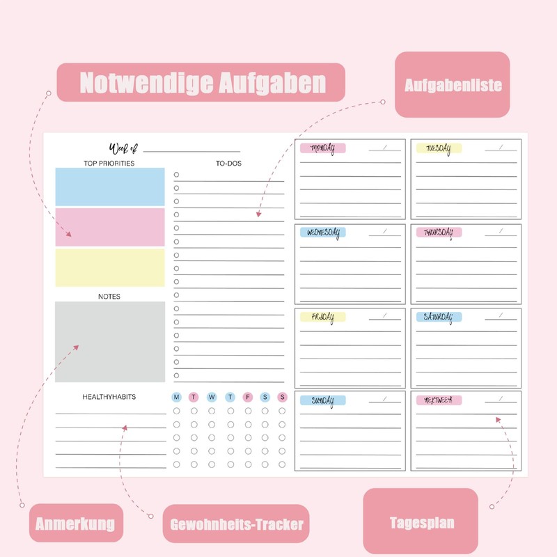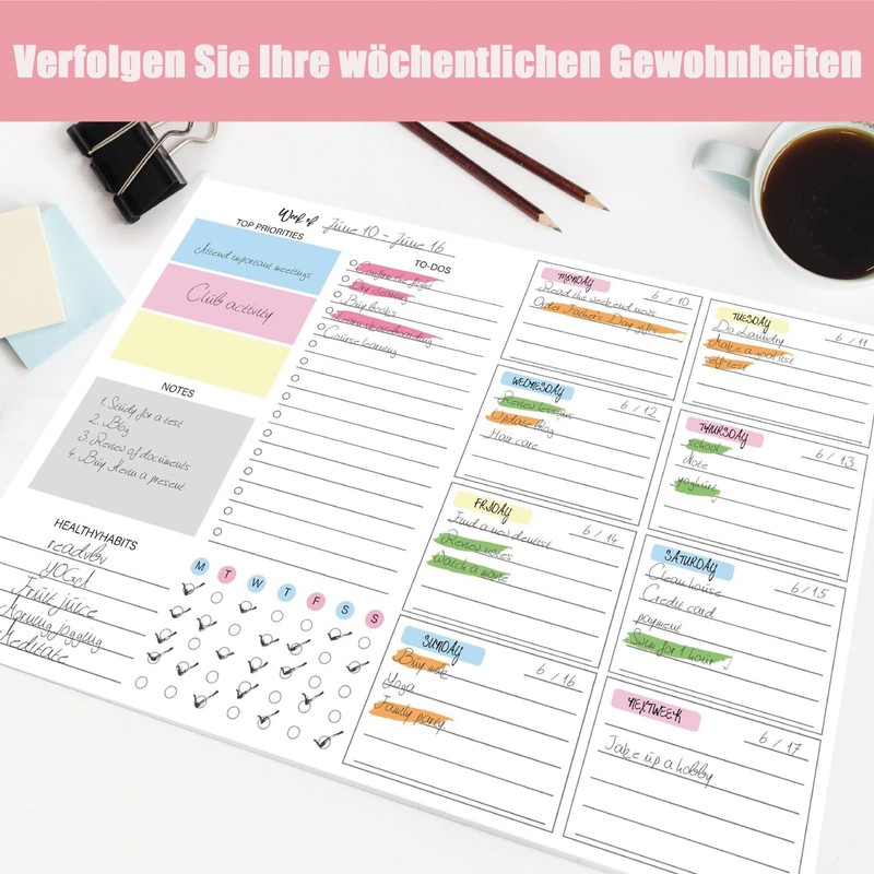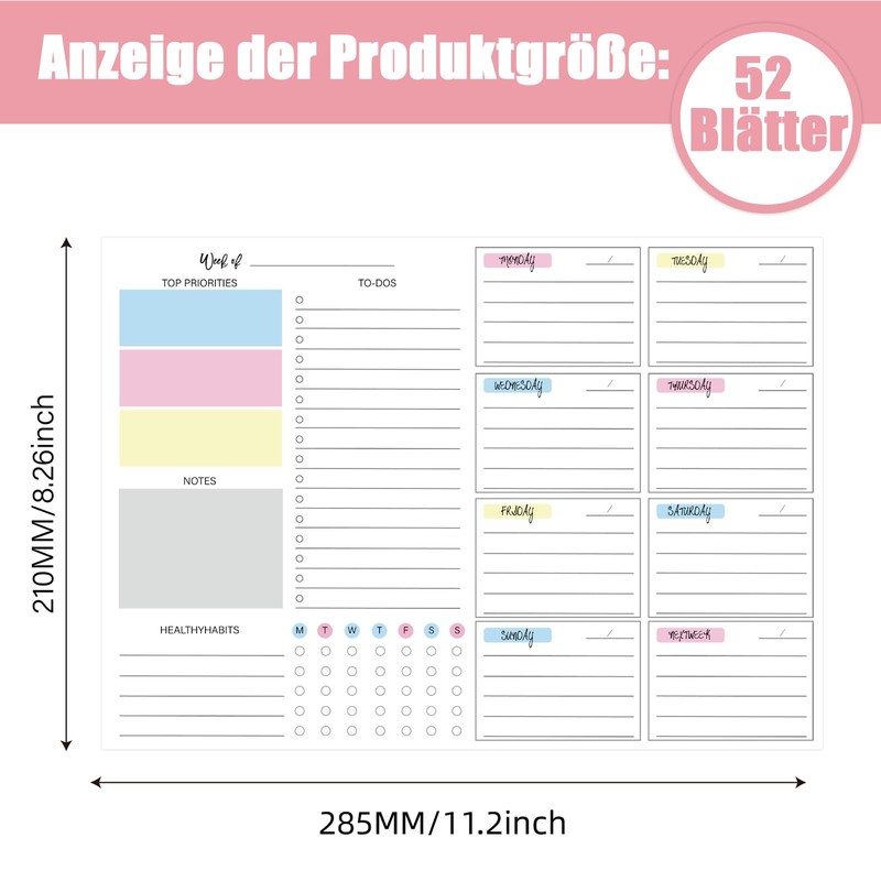 4.In A4 size (280 x 210 mm) per sheet, it is perfect to take with you and ideal for the desk in the office, school or college as well as on the go. You can write your important tasks, spontaneous notes or long-term reminders in the useful text box and start the week organised and motivated.