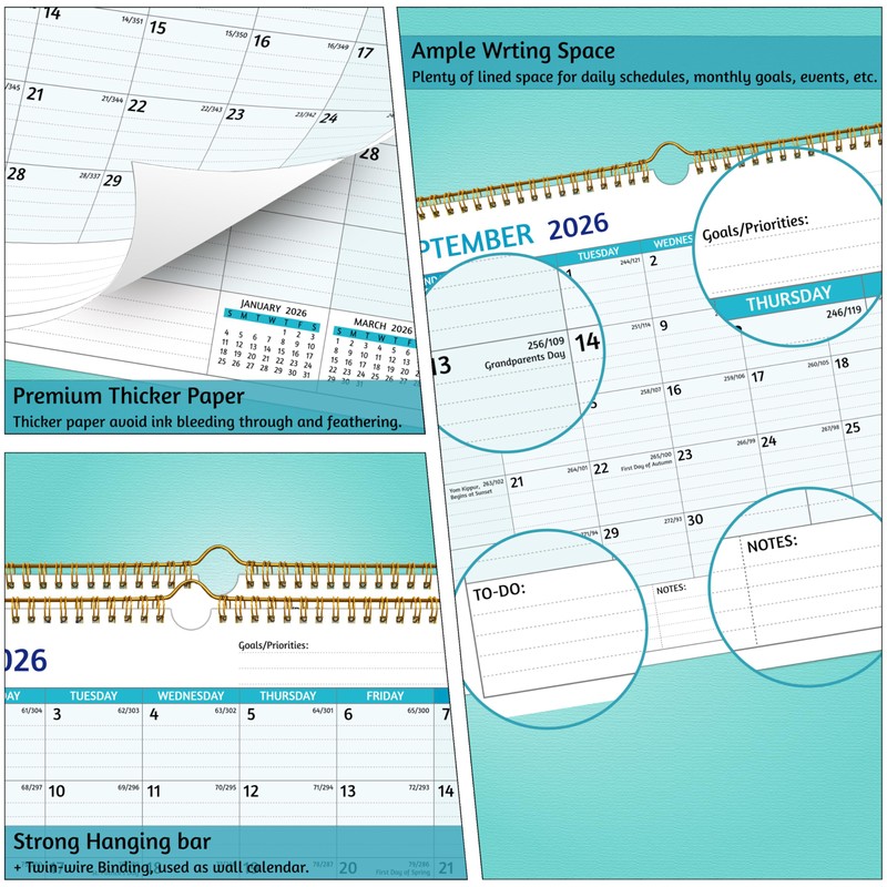 - ✅ INK-RESISTANT PAPER – This 2026 calendar is made of premium thicker paper, which can well avoid ink breeding through and provides you with a smooth writing experience. Featuring twin-wire binding for easy page turning, and strong bar works well keep this calendar hanging on the wall.