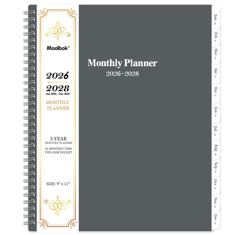 2026-2028 Monthly Planner/Calendar - January 2026 - December 2028, 3 Year Months Planner 2026-2028, 9'' x 11'', 36 Monthly Tabs, 2-Side Pocket, Gray