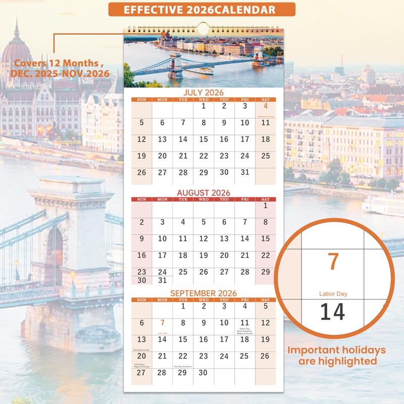 - 2026 Wall Calendar - This 3 month wall calendar 2026 covers 12 months from January 2026 to December 2026 for planning and organization. The generous 11"x26" format provides optimal visibility while the reinforced twin-wire binding ensures durability for homes, offices, and classrooms.