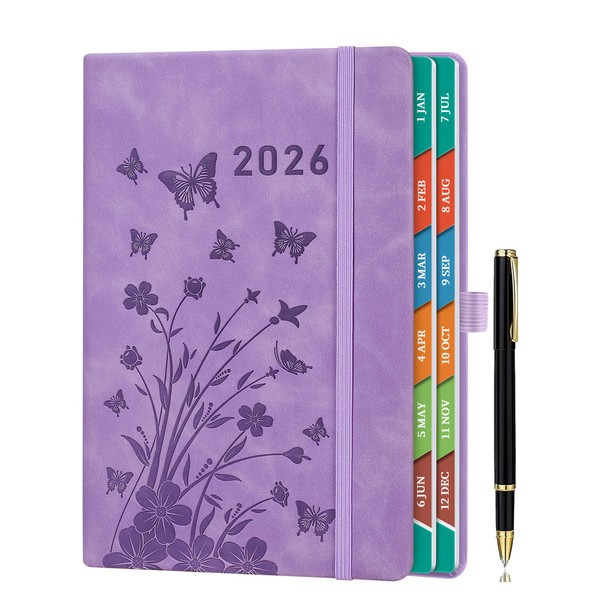 2026 Diary Day per Page, A5 Diary Page a Day January to December, Daily & Monthly Planner with Colorful Monthly Tabs, Floral Design, Elastic Pen Holder, 2 Bookmarks, Pen Loop & Inner Pocket, Lavender.