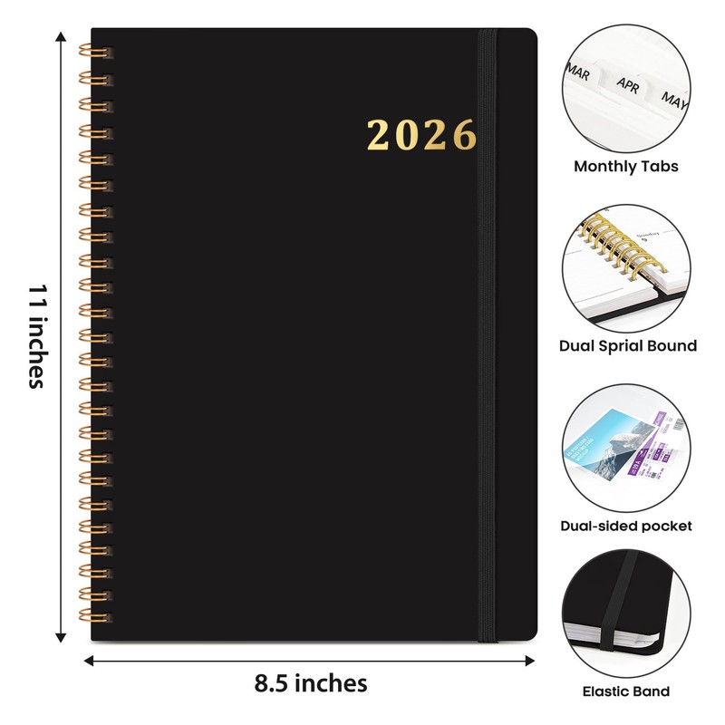 2026 Planner 8.5" x 11", Weekly and Monthly Calendar Planner Book, January 2026 - December 2026, Hardcover Spiral Planner with Monthly Tabs, Notes Pages, Perfect for Women & Men, A4 - Black