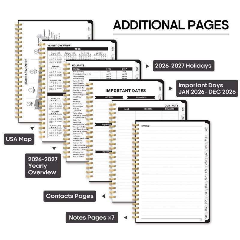 - Distinct Design: Built with strong spiral binding and a durable hardcover, this planner is made to last. It features dual storage pockets, a full 2026–2027 yearly overview, a U.S. map for quick reference, and additional lined note pages at the back—providing extra space for ideas, reflections, or important information. A perfect planner for women, men, teachers, and students alike.