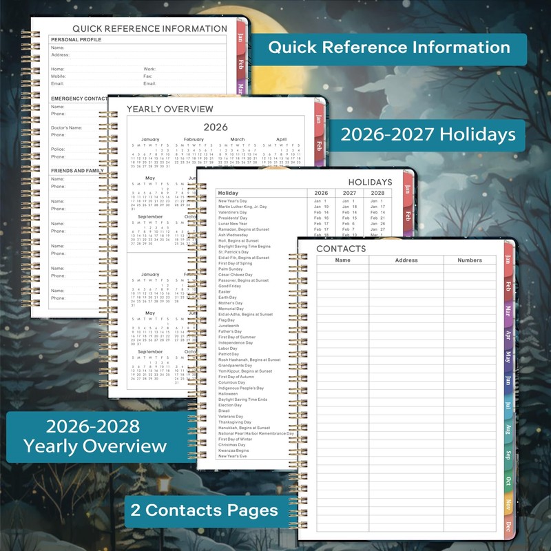 - Feature of Planner 2026 - | Hardcover | Colorful Monthly Tabs | Premium Paper | Twin-Wire Binding | Inner Pocket | Elastic Closure | Contact Pages | Quick Reference Information | Yearly Overview | Reference Calendar | Holidays |