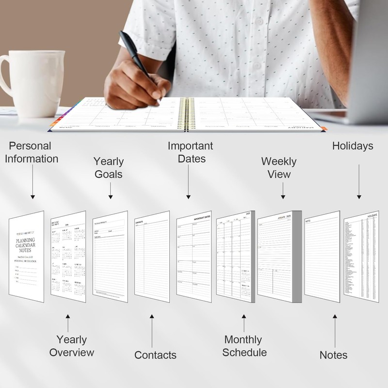 - Extra Pages - Yearly calendar planner includes a convenient list of holidays, reference calendars, contacts pages and extra notes pages to accommodate your scheduling needs