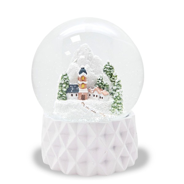 20301 Christmas Snow Globe, Mountain Village in the Snow, White Cubic Base, Height: 12 cm, Width 10 cm, 20301 (Bergdorf White Cubic)
