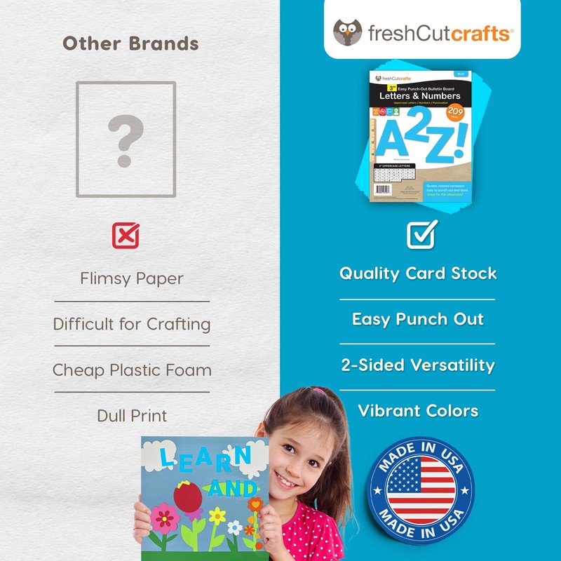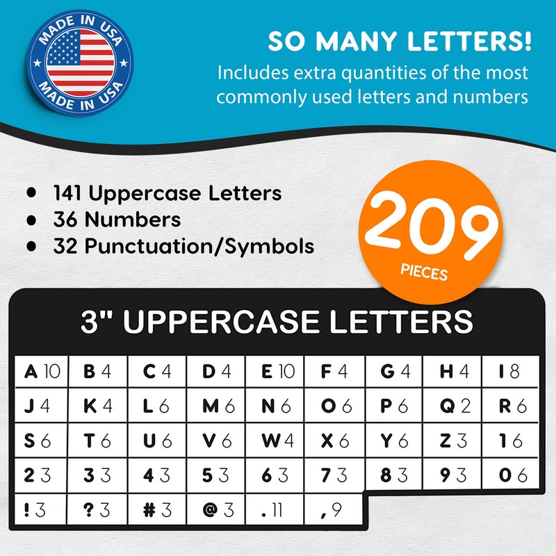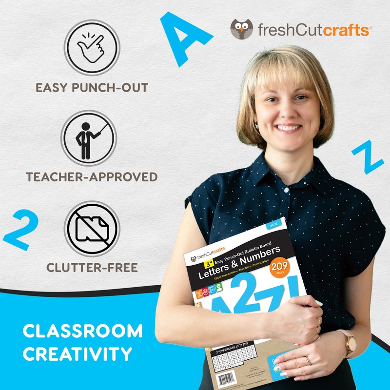 - VAST SELECTION FOR CREATIVITY: This pack offers a comprehensive assortment of 209 pieces, 3-inch capital punch-out letters, numbers, symbols, and punctuation on high-quality US-made blue cardstock. These letters for bulletin board are perfect for creating an extensive range of designs, from bulletin board letters to paper letters for classroom decor, banners, and more, providing ample options to fuel your creative projects.