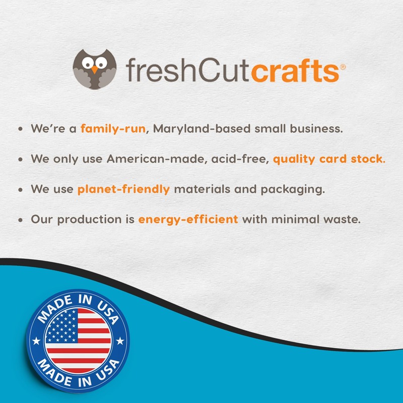 - FEEL-GOOD CRAFTING: At FreshCut Crafts, we're all about crafting with a conscience. Our products are not only about creativity but also about making a positive impact. Proudly family-made in the USA, we use high-quality, acid-free American-made paper that's perfect for preserving memories and creating lasting keepsakes. Our energy-efficient production processes are designed to minimize waste, ensuring that we leave a smaller footprint on the planet.