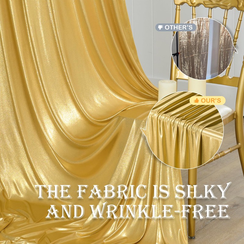 • Shiny Fabric Backdrops: Silky Touch Feeling; Drape Nicely; Washable; Ironable; Reusable. You can keep this shiny backdrop drapes for future events. The soft fabric backdrops are perfect to create beautiful folds or leave it flowing loose onto the floor.
