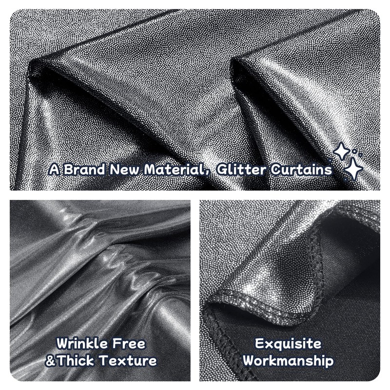 • Easy to Care Black Silver Shimmer Curtains Our 10ft Black Silver sequin glitter party background curtain panels are made of wrinkle-free material, which could be used without ironing. Let you make unforgettable memories for your family or your friends.