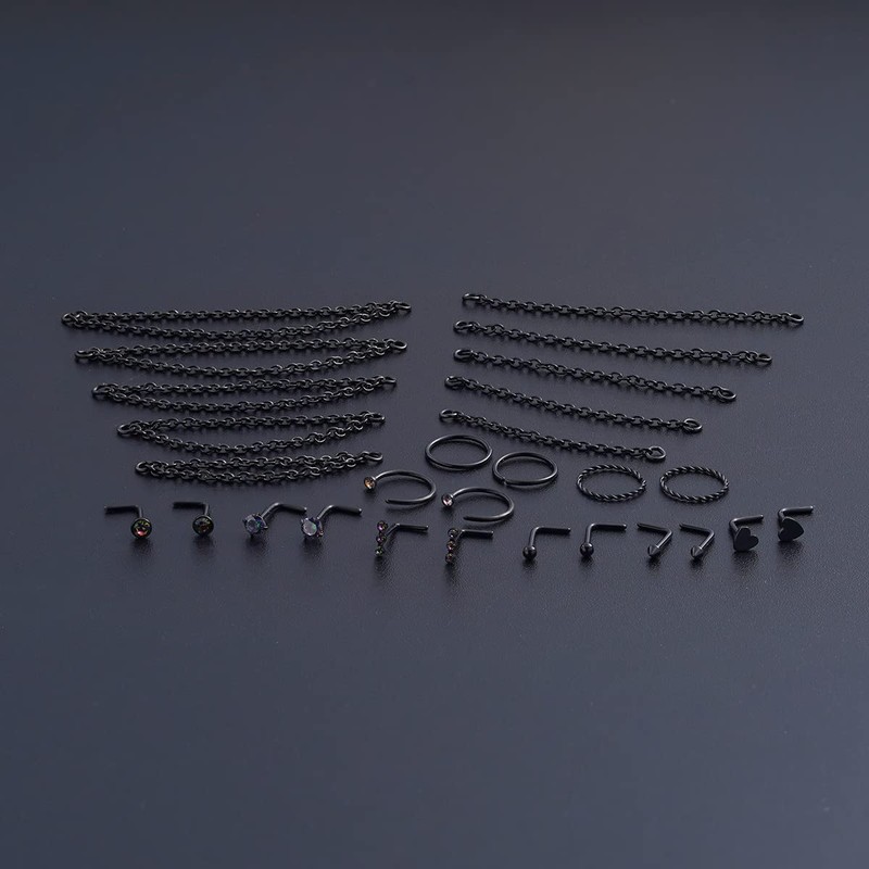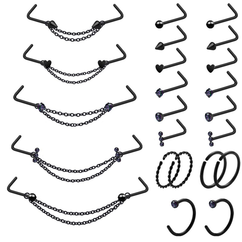 - PACKAGE INCLUDE: 12PCS 20G Black L Shaped Nose Ring Stud, 6PCS Black Nose Ring Hoops, 5PCS Black Singe Nose Piercing Chain. Dazzling Stainless Steel Nose Rings are Always the Best Gift for Family and Friends.