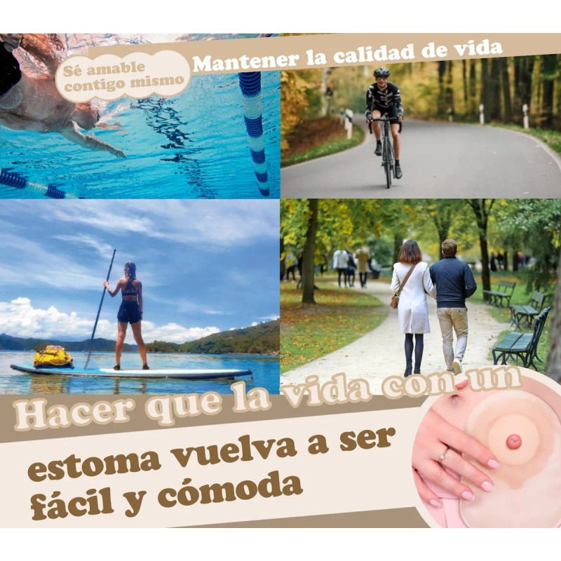Con protector de piel integrado a base de carboximeticelulosa sódica con adhesivo, con guía recortable que permite abrir orificio para el estoma a diferentes medidas que van desde 20mm hasta 60 mm.