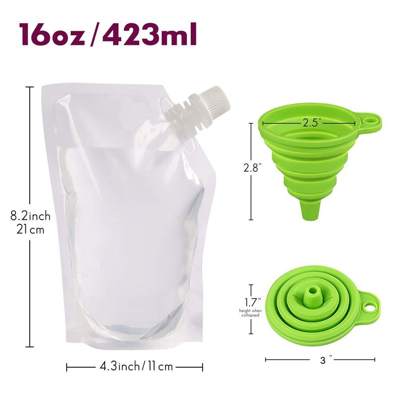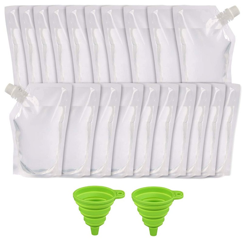 20pcs 16oz Plastic Flask for Liquor, Drink Pouches for Adults, Liquor Pouch Bulk, with 2 Collapsible Silicone Funnels, Reusable and Concealable Sneak Bags for Travel Cruises, BPA Free