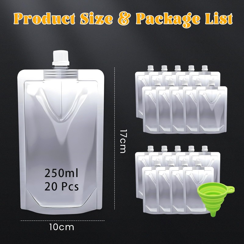20pcs 250ml Foil Pouches for Festivals, Secret Flask with Screw-on Caps, 100°C Heat Resistance, -20°C Freezing, Good Light Avoidance Moisture-Proof and Freshness Preservation – Camping and Festi