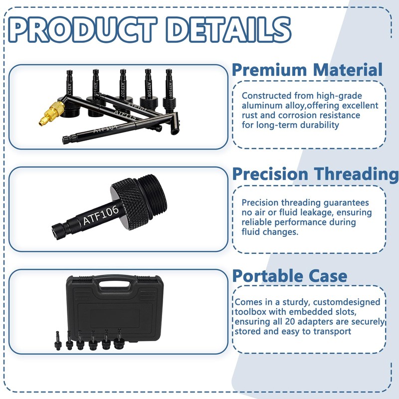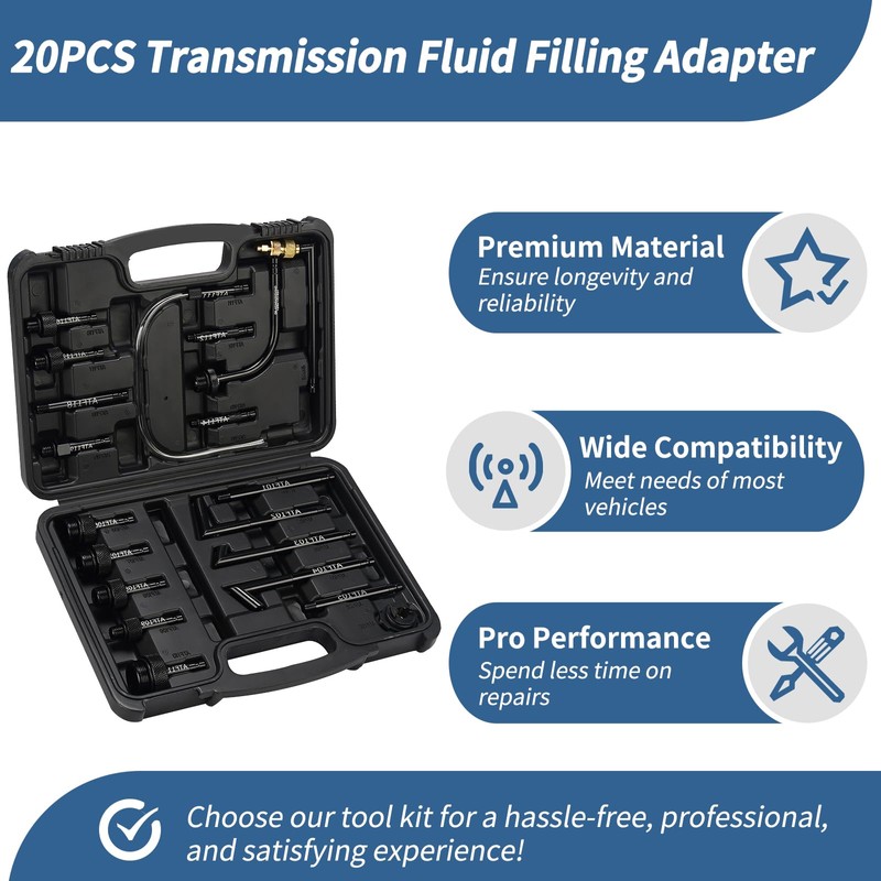- 【Convenient Portability】 Simplify the storage and transport of your Bicos transmission fluid fill adapters with our meticulously designed blow-molded toolbox. This toolbox includes inlay storage to secure all 20 ATF filler adapters, ensuring secure storage, easy organization, and hassle-free transportation.