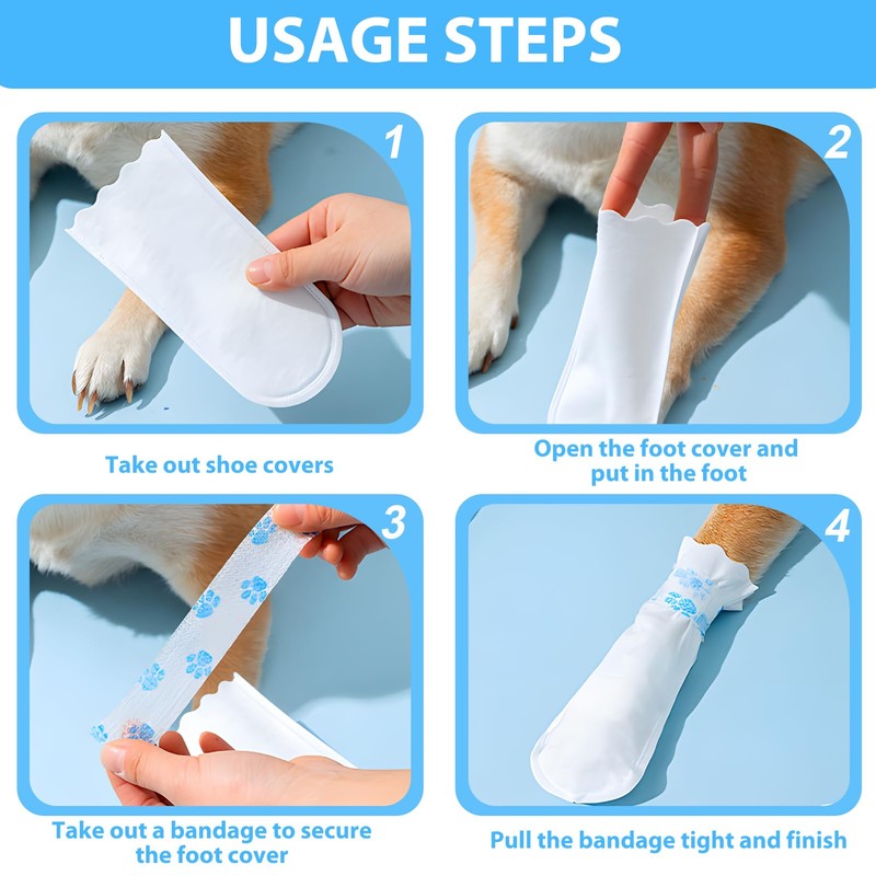 - Easy Application: Simply slip the disposable shoe cover onto your dog's paw, wrap it around their leg using the self-adhesive bandage, and press firmly. This secure application keeps the socks in place during various activities, providing reliable protection for your pet's paws.