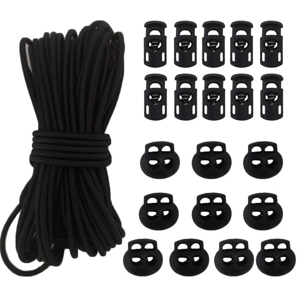 20pcs Plastic Cord Locks with 1/8-Inch 50ft Elastic Cord Heavy Stretch Round String, 10Pcs Sing-Hole, 10pcs Double-Hole Spring Toggle Stopper Slider Black (3mm-Black)