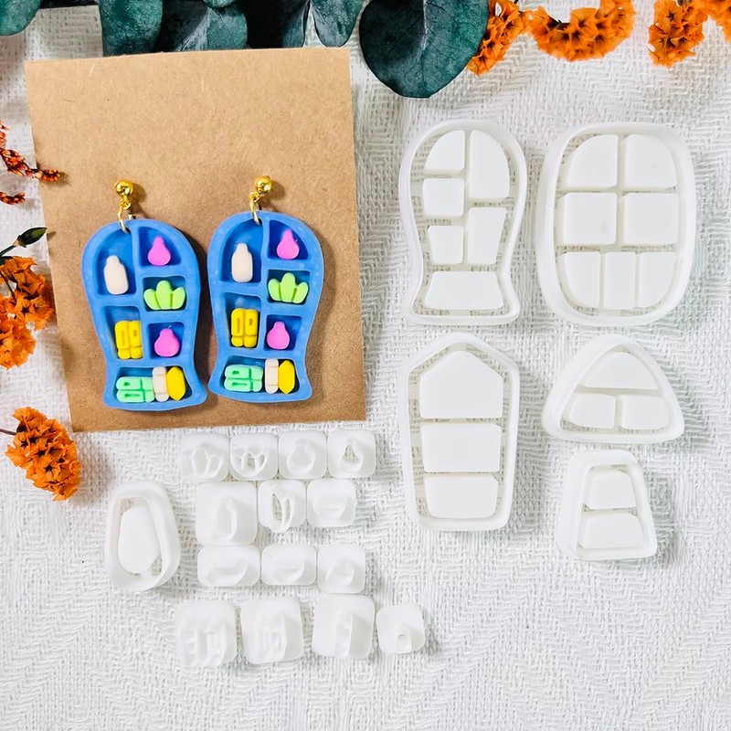 - 【Unique Display Shelf Design – Create Miniature Diorama-Inspired Pieces】This set features multiple clay cutters shaped like decorative shelves and tiny items like jars, plants, and bowls. It lets you build playful bookshelf-style earrings or brooches with vibrant color and texture.