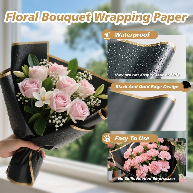 - Modern Glossy Flower Wrap with Black Gold Edges: Flower paper wrap features classic translucent material with high gloss and vibrant colors, paired with black gold frosted edges for a modern look. Smooth, comfortable touch enhances both aesthetics and grip