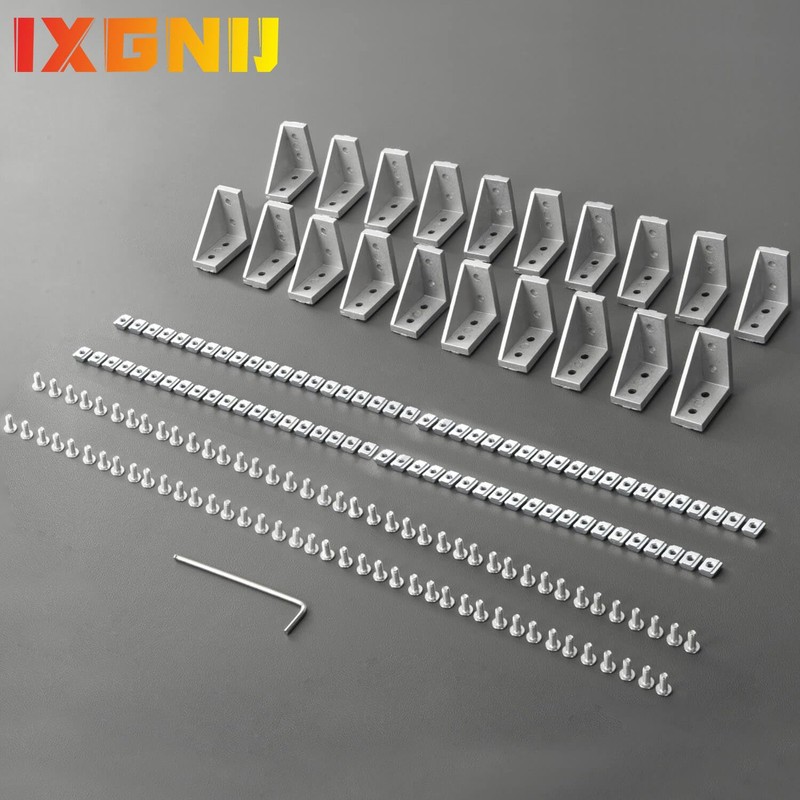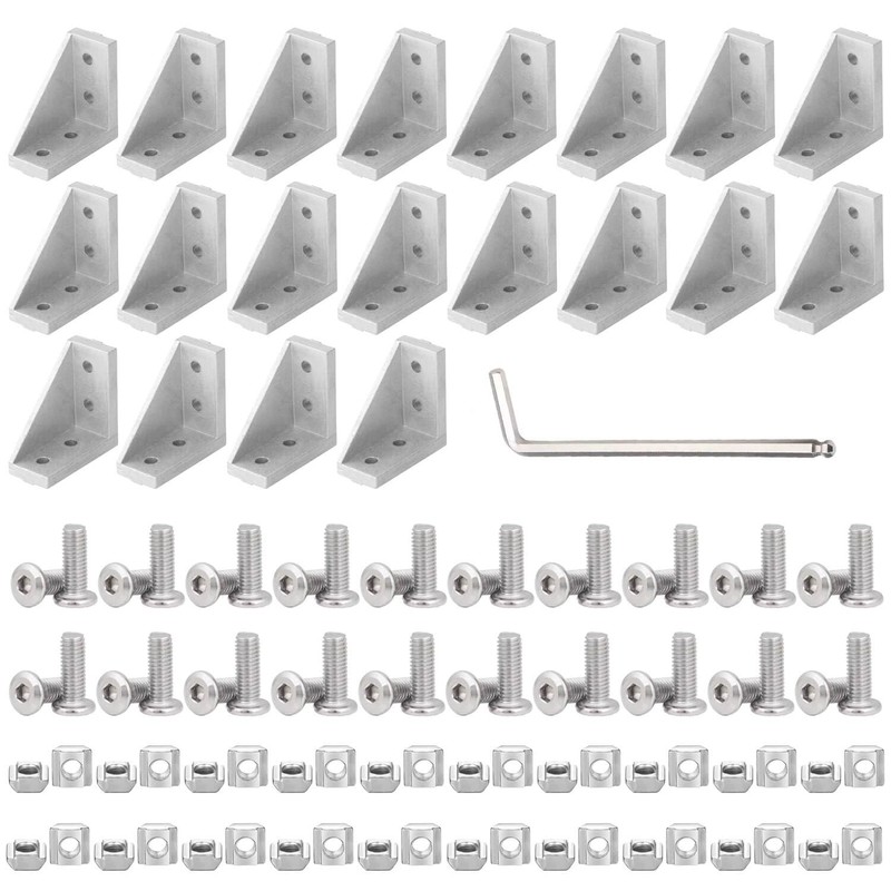 - Package Content: 20pcs 90 Degree solid cast aluminum corner bracket,80pcs M5 T-nuts, 80pcs hex screw,1pcs wrenches tool.