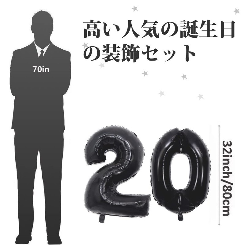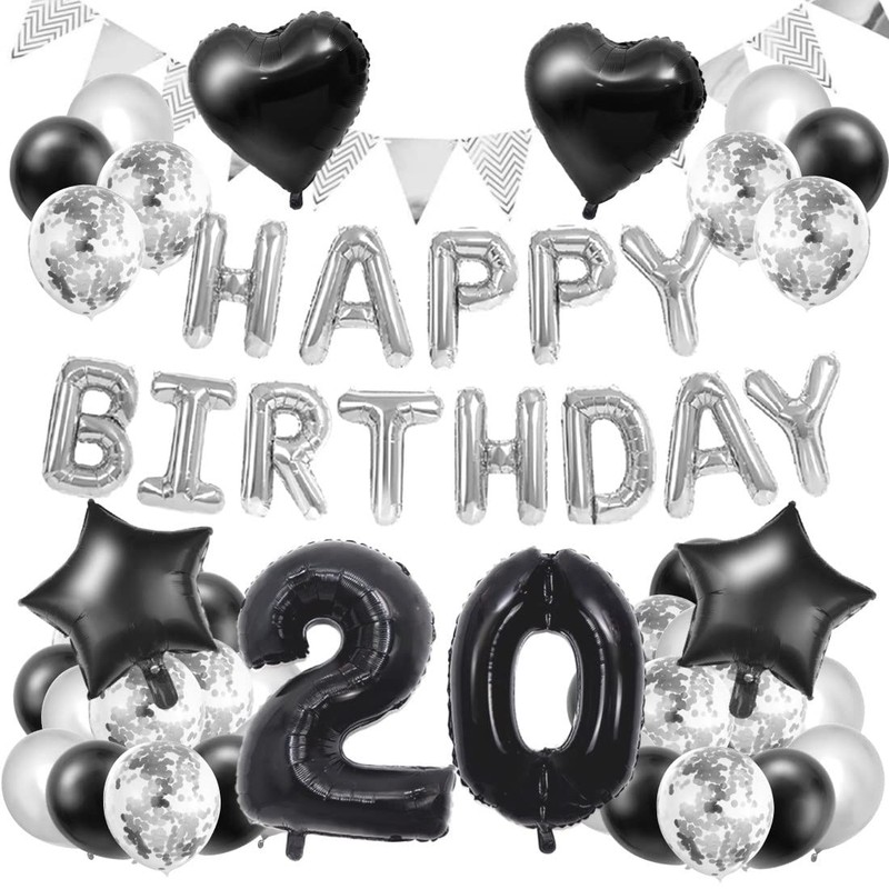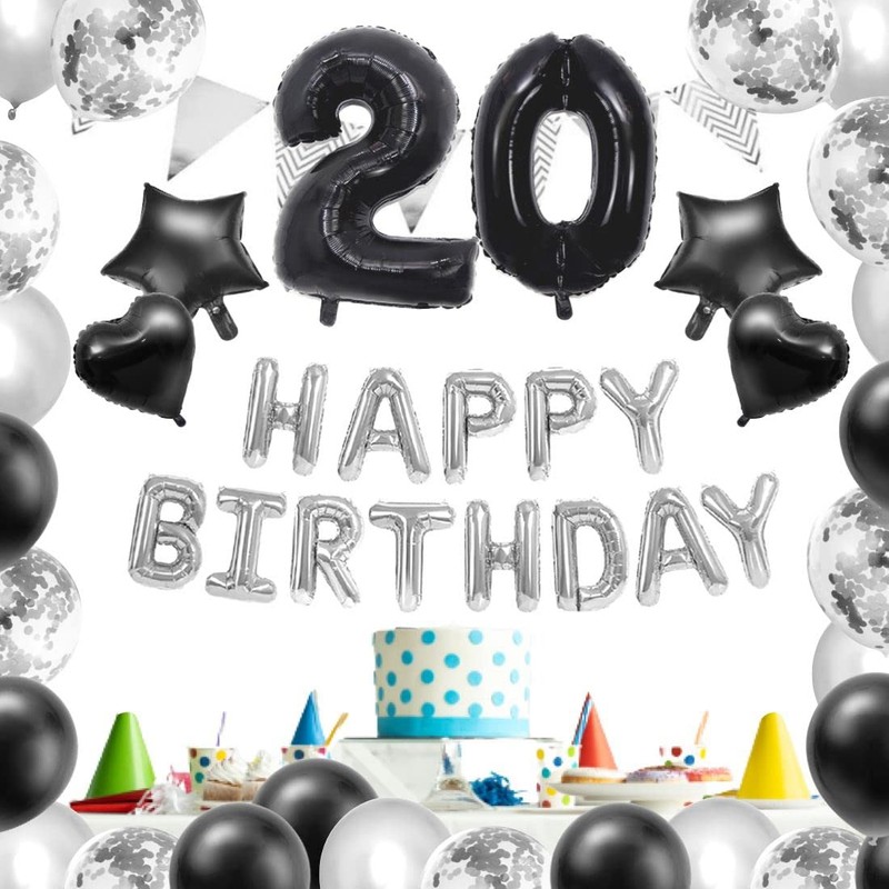 20th Birthday Balloons, Decorated, 31.5 inches (80 cm), 20 Number Balloons, Combination, Happy Birthday Garland, Numeric Balloons, Confetti Balloons, Party Surprise, Includes Air Pump, 40 Pieces (Black, 20)