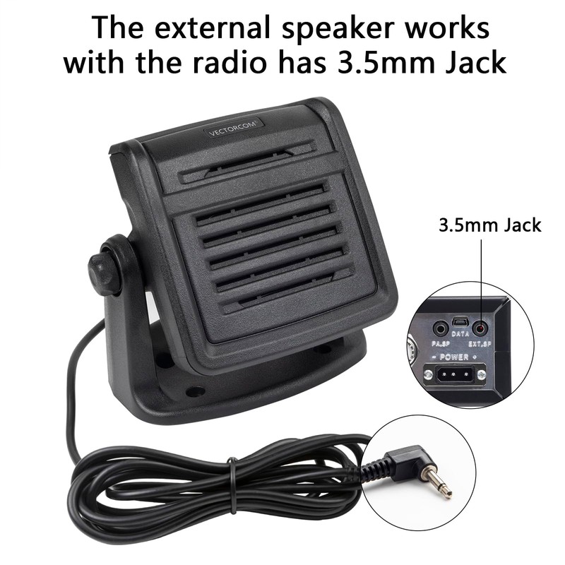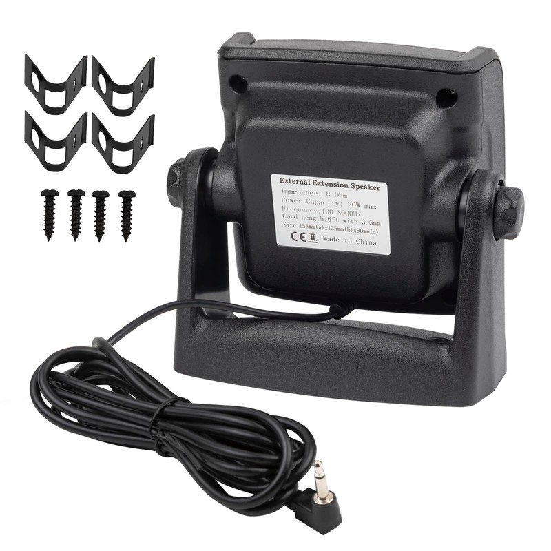 - External Speaker compatible with Ham Radio, Mobile Transceiver, GMRS Mobile Radio,10 meter Radio, CB radio, Marine radio and DMR Mobile radio, known for durability, reliability, and high-performance and engineered for outdoor use and challenging environments. Impedance: 8 ohms for the External Extension Speaker Power Capacity: 20W max for the External Extension Speaker Frequency Range: 100-8000Hz for the External Extension Speaker Cord Length: 6ft length with 3.5mm plug Dimensions: 155mm(w)x135mm(h)x90mm(d) for the External Extension Speaker