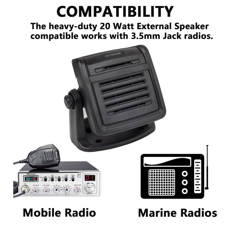 - External Speaker compatible with Mobile Radio, Mobile Transceiver, GMRS Mobile Radio,10 meter Radio, CB radio, Marine radio and DMR Mobile radio.20W power capacity of External Speaker enhance your audio experience with crisp clarity! Crisp Clear Sound with the External Speaker. Enjoy enhanced audio quality for clear communications with the External Extension Speaker.