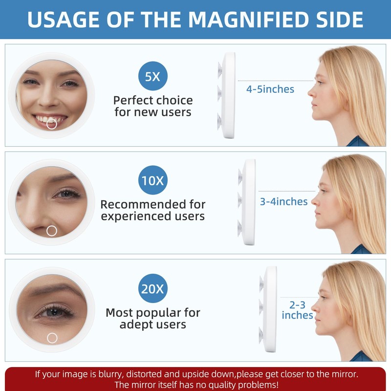 - 【COMPACT MAGNIFYING MIRROR WITH LIGHT】The 20x magnifying mirror with lights has 3 suction cups, compact magnified mirror size: 4*4inches; Weight: 0.15lbs can be stored in a pocket, handbag or cosmetic case. It's especially good as a lighted 20x makeup magnifying mirror for travel.