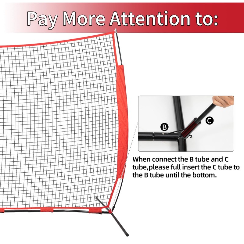 - Note:Our lacrosse backstop net more suitable for preventing the ball from flying around, and is not for professional baseball batting.When installation,please fully insert the C tube into B tube.