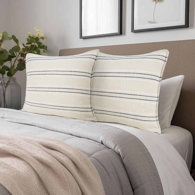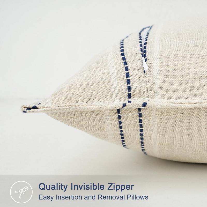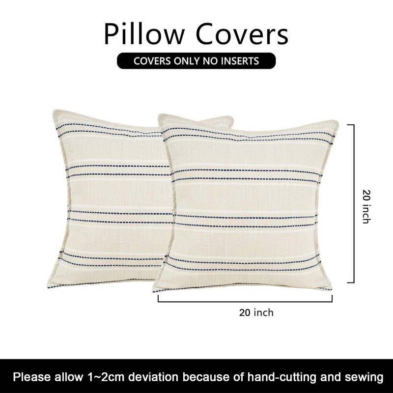 20X20 Decorative Farmhouse Linen Throw Pillow Covers, Boho Textured Pillow Case Set of 2,Beige with White & Blue Stitch Yarn Dyed Stripe Cushion Cover ,Modern Accent Square Pillowcase for Sofa Couch