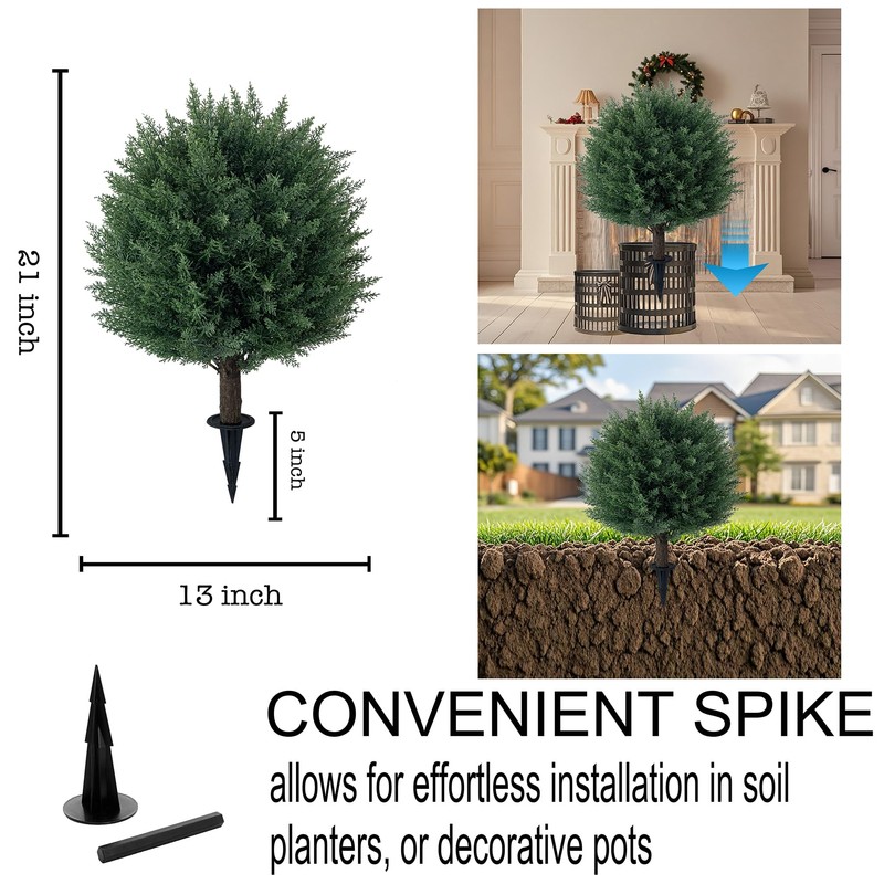 - Packaged for Your Convenience: The package includes 2 artificial cedar topiary trees with ground plugs for easy setup; Standing at a total height of about 21 inches, with a tree height of 16 inches/ 42 cm and ground plugs measuring 4.9 inches/12.5 cm, this artificial cedar topiary tree fits perfectly in home or office spaces; The good size offers ample flexibility for installation.