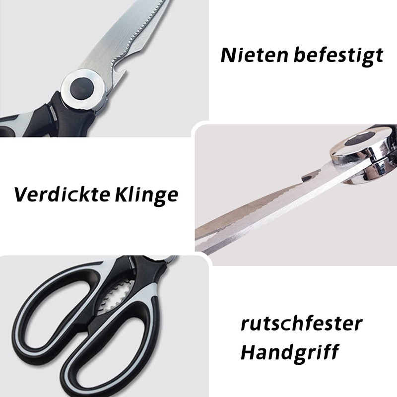 - Multifunctional kitchen scissors, also for scraping fish scales, opening bottle caps, nuts and more.