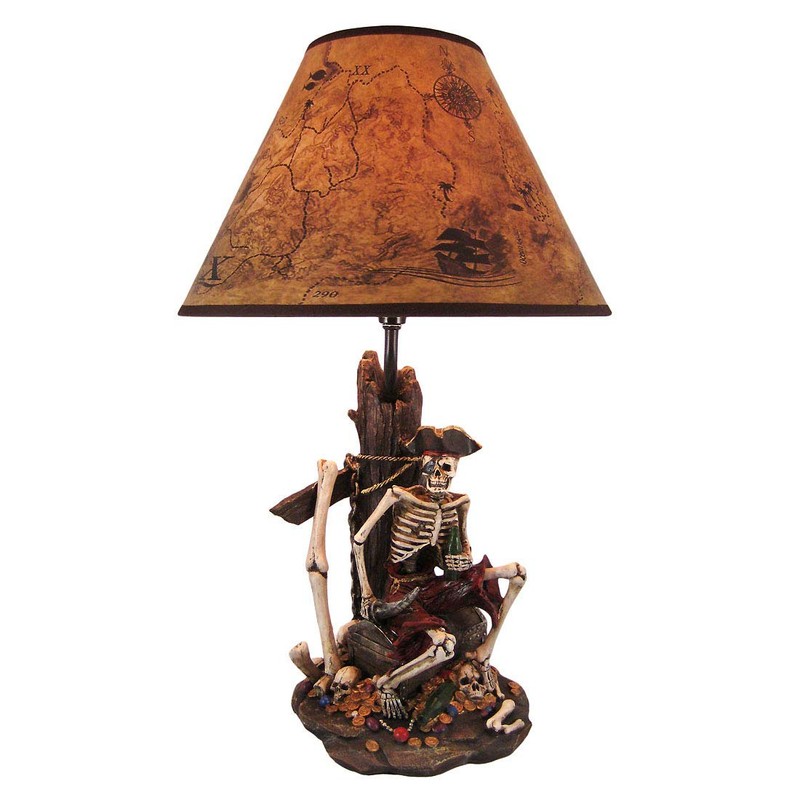 This awesome table lamp depicts a shipwrecked pirate skeleton atop a treasure chest, with timbers from the ship acting as the lamp base. Measuring 21 inches tall, including the 13-inch diameter shade, the lamp is a wonderful decorative accent for pirate lovers or any room with a Caribbean or nautical theme. Made of sturdy cold cast resin with a pirate treasure map lampshade, this lamp is ready to sail the high seas of style. This lamp is UL approved, it uses one Type-A 60W bulb (not included) and has a 53-inch power cord with an in-line toggle switch.