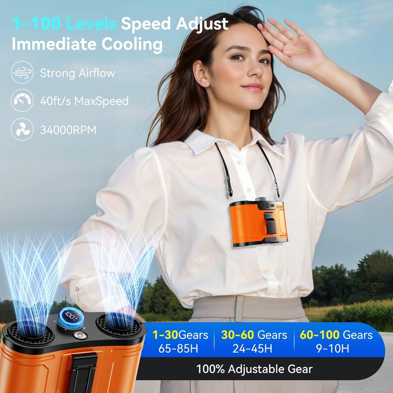 - Customizable Cooling – 100-Level Precision Control: This waist hanging fan offers 100 levels of stepless speed adjustment, letting you fine-tune airflow exactly how you like it. Whether you're on a construction site or relaxing at a campsite, enjoy a cooling experience tailored to any activity.