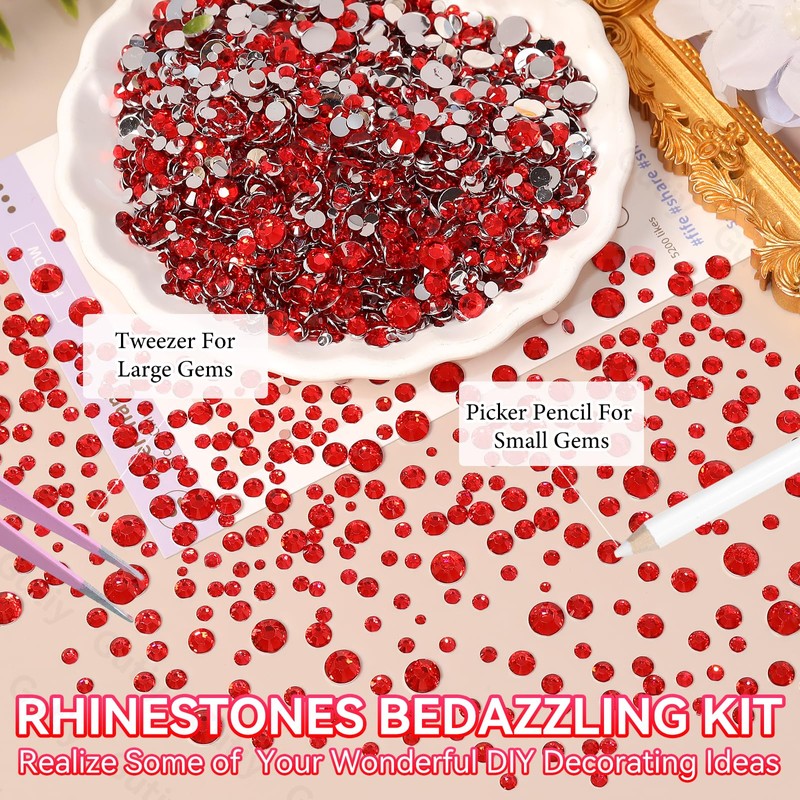 - Premium Bedazzling Kit: Includes 1 organizing box with 24 grids, meticulously sorted by size: 2mm (2 grids), 3mm (6 grids), 4mm (6 grids), 5mm (6 grids), and 6mm (4 grids), totaling approximately 21,000 Pcs red resin gems rhinestones. Specially equipped with 1 precision tweezer + 1 diamond applicator pen for effortless pickup; thoughtfully includes a tube of B7000 jewelry glue. From tools to materials, everything is provided in one kit to perfectly bring your creative decorations to life