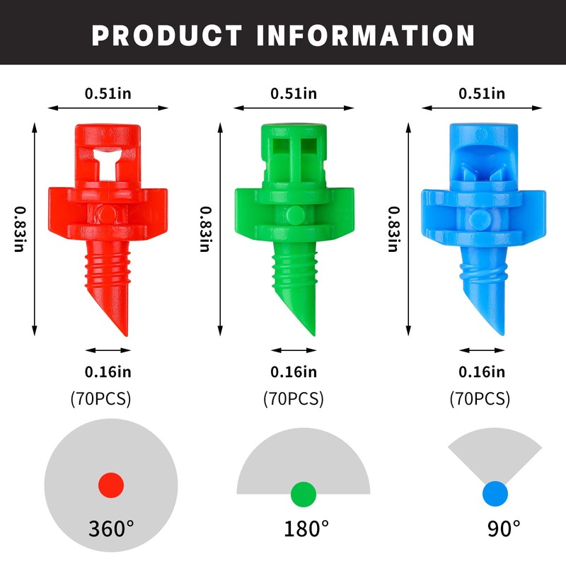• 210Pcs Irrigation Package: Package includes 70 blue 90 ° spray nozzles, 70 green 180 ° spray nozzles and 70 red 360 ° spray nozzles. The spray is 21 x 12 mm/0.82 x 0.47 inches in size and has 210 drip irrigation system nozzles