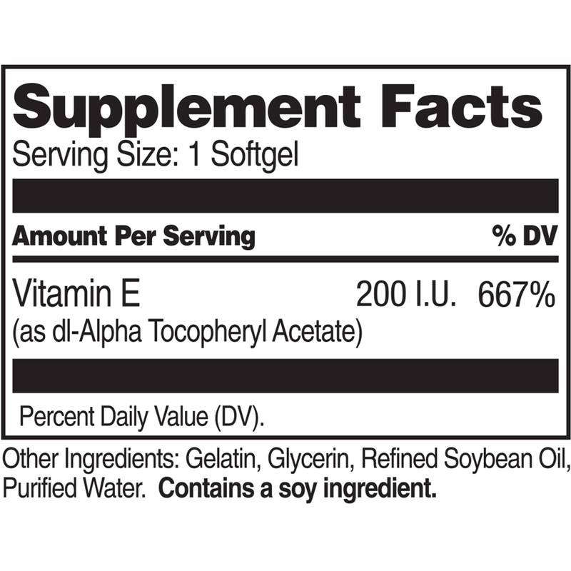 21st Century's Vitamin E-200 (dl-Alpha Tocopheryl Acetate) is an essential antioxidant nutrient that helps maintain red blood cells and muscle tissue such as cardiac and skeletal muscles. No added sugar, salt, yeast, artificial flavors, colors or preservatives.