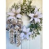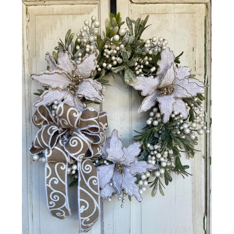 22"-24" Round Front Door Christmas Wreath with Cream Berries, Glittered Mistletoe, White Poinsettias with Gold Glitter Trim