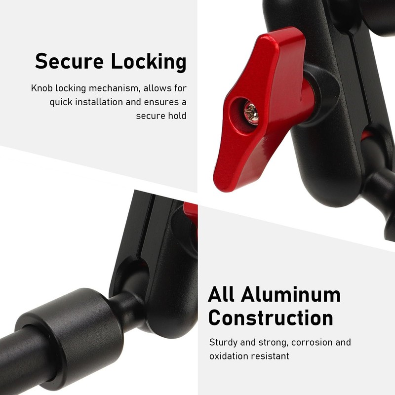 - [Multi Angle Adjustment] Featuring red knobs, this arm can rotate 360 degrees, while the ballhead can rotate 180 degrees, providing flexible and precise adjustment. The ballhead has a damping ring for enhanced stability.