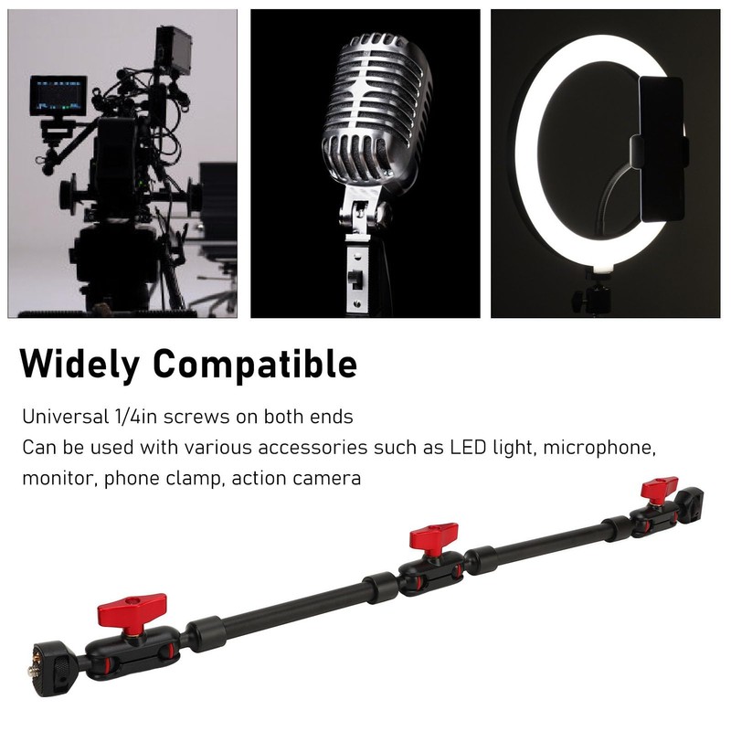 - [Widely Compatible] With universal 1/4in screws on both ends, this articulating arm can be used with various accessories such as LED light, microphone, monitor, phone clamp, action camera.