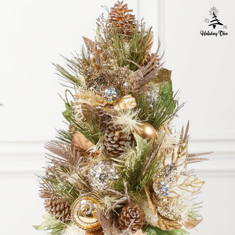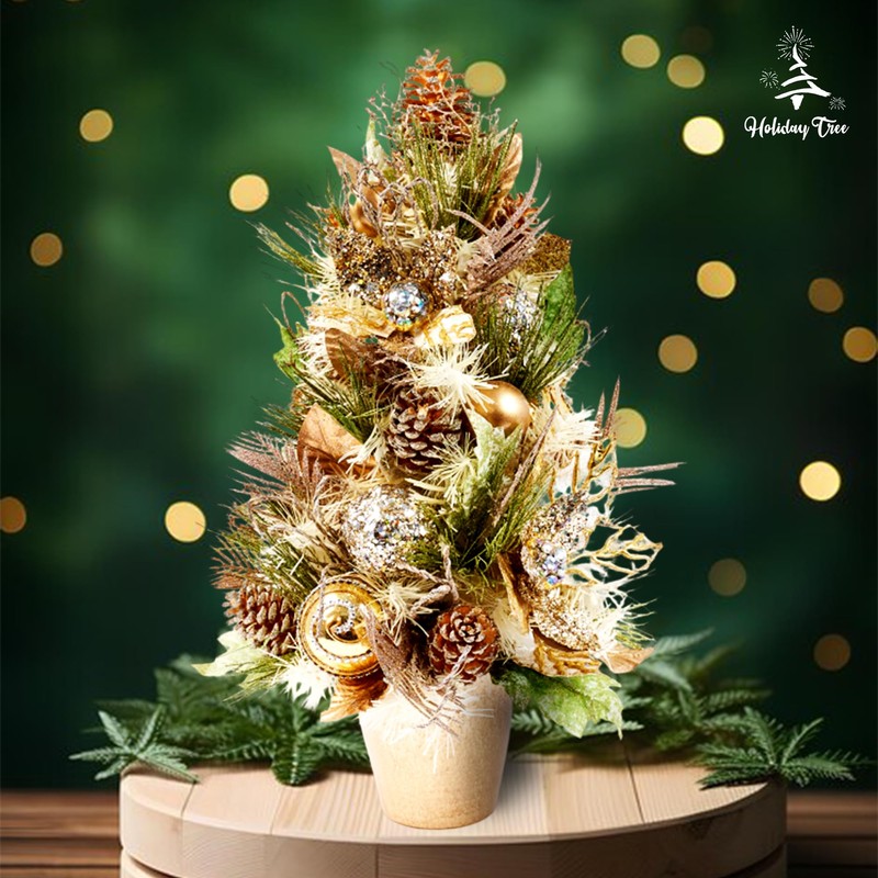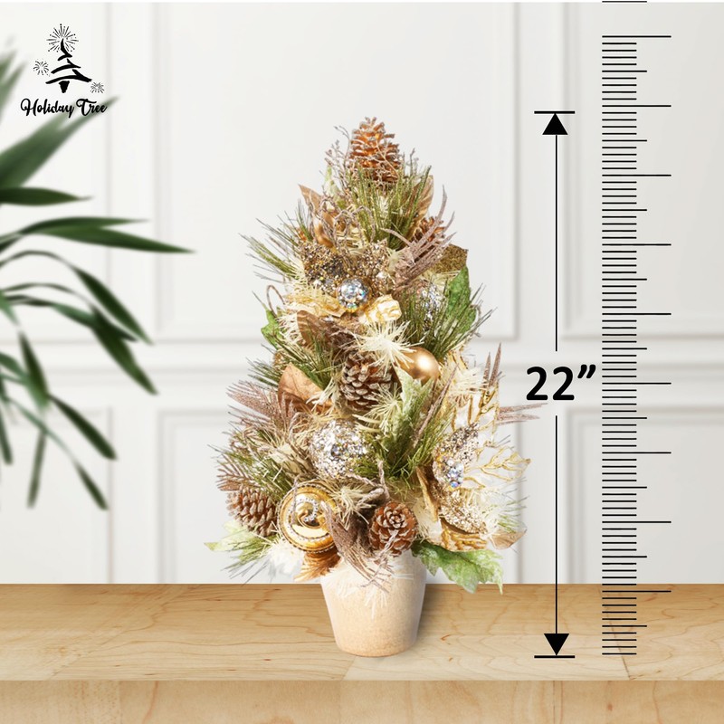To ensure it's ready for display right out of the box, our tabletop tree also comes with a chic pot that complements its design. Make this holiday season unforgettable. Bring home the magic, the tradition, and the luxury with our 22’’ Handcrafted Premium Christmas Tabletop Tree Champagne Gold Poinsettia Cone with Pot.