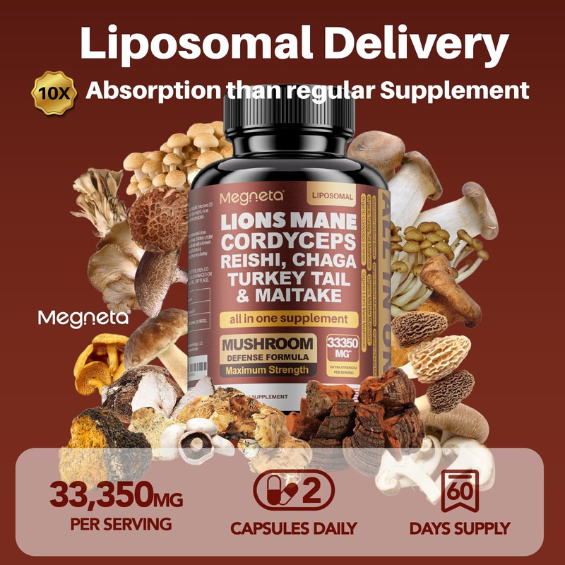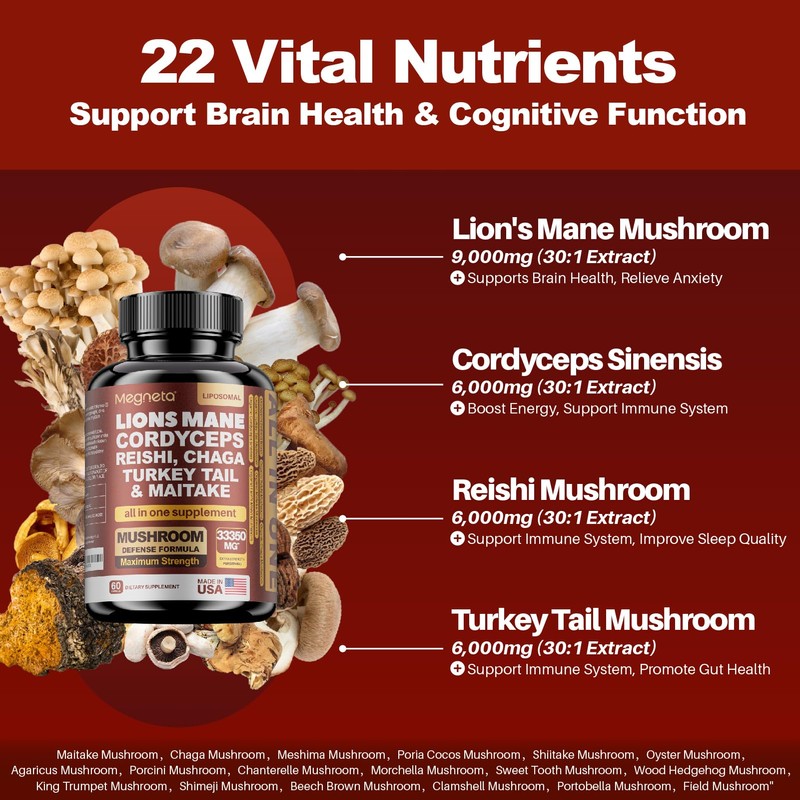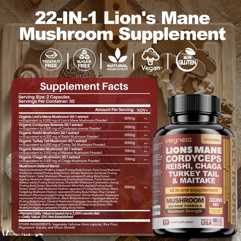 22 in 1 Multi Mushrooms Capsules Lions Mane 9,000mg Cordyceps Sinensis 6,000mg Reishi Mushroom 6,000mg Turkey Tail Mushroom 6,000mg (1 Pack 60 Count)