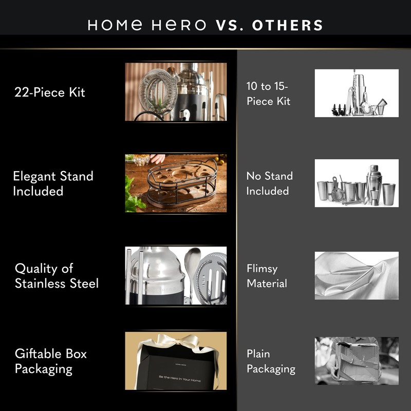 • The 22-Piece Ultimate Bar Set - This all-inclusive bartender set is essential to any home bar. We have thoughtfully designed it in-house to include all the bar essentials like, strainers, bar spoons, cocktail shakers, muddlers, ice tongs, and much more. Be assured, your next party is sure to be a success!