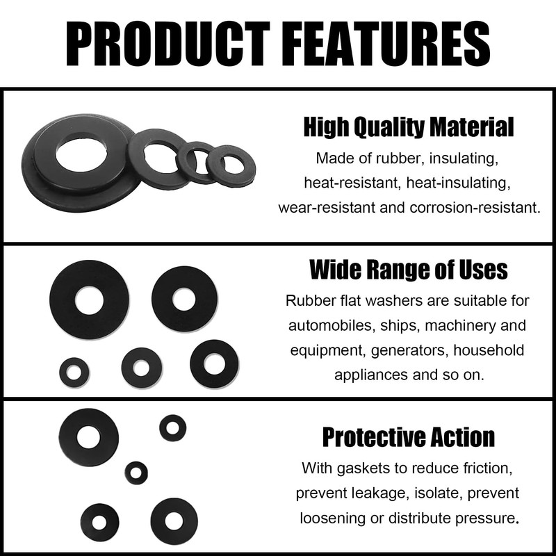 - ◎【Premium Quality Rubber】 Made of flexible and elastic SBR material, these rubber washers for bolts are sturdy, durable, and won't scratch surfaces. They're leak-proof, cushioning, and shock-proof, making them superior to other materials.