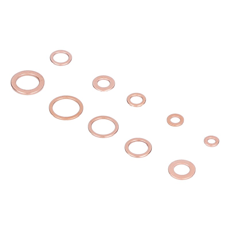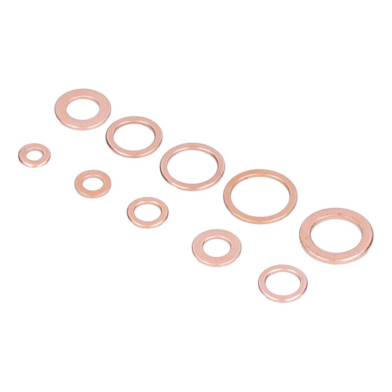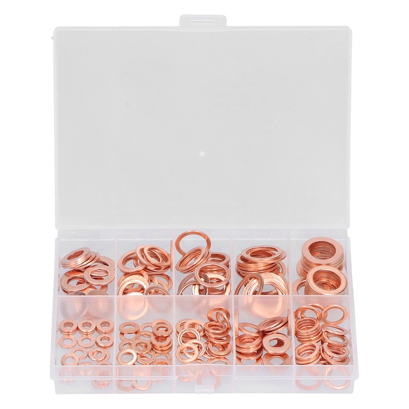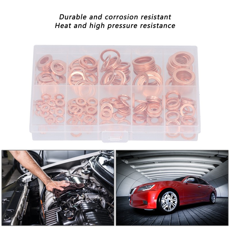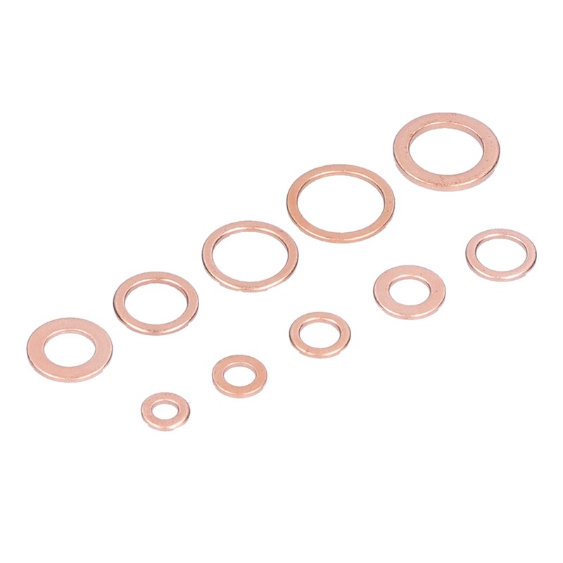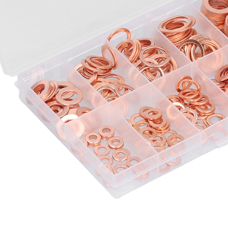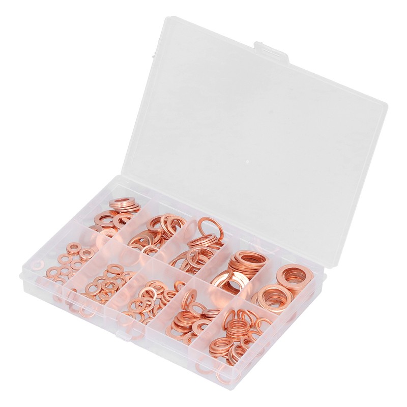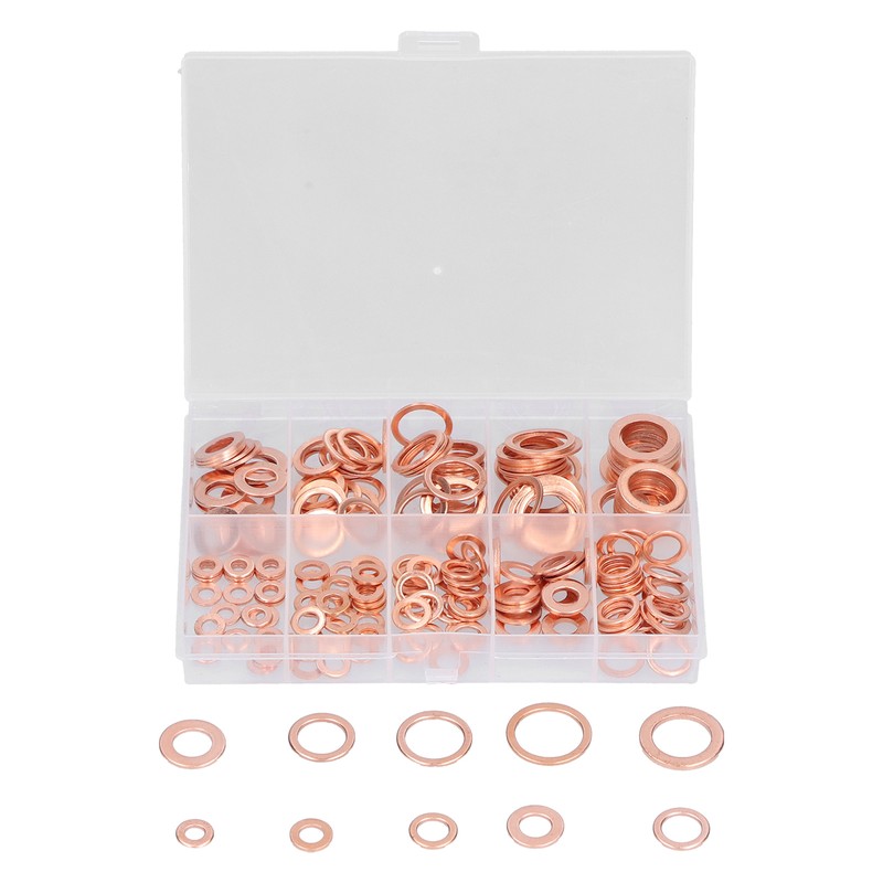 1、HEAT RESISTANT MATERIAL: These gaskets are made of excellent copper material, heat and high pressure resistant, anti corrosion and durable. 2、MULTIPLE SPECIFICATIONS: These flat washers include 10 common sizes, and different sizes can meet different tightening needs. 3、HIGH COMPATIBILITY: The gasket is highly compatible with the nuts and bolts, and the connection is tight, which can prevent the screw from sliding and tearing. 4、GOOD SEALING: The melting point of copper is as high as 1083℃, which makes the gasket have good electrical and thermal conductivity. 5、CLASSIFIED STORAGE: All gaskets are sorted by size and placed in a sturdy transparent storage box to prevent loss and mixing.