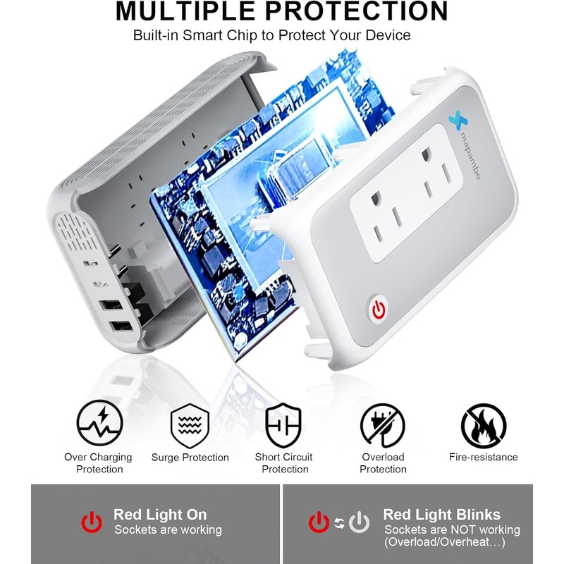 - 6-in-1 International Power Converter: Mapambo 220V to 110V converter features 2 U.S. AC outlets, 2 USB-A ports, and 2 USB-C ports, allowing you to charge up to 6 devices simultaneously. It's perfect for powering all your travel essentials, including phones, tablets, laptops, cameras, gaming consoles, speakers, smartwatches—even hearing aids.