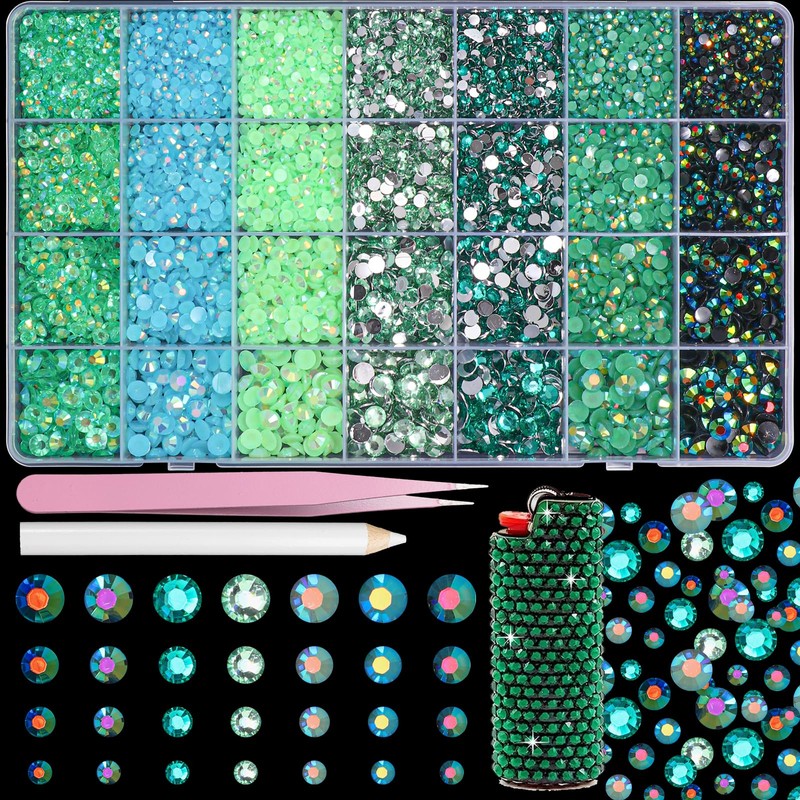 - What You Get: There are 28 grids of flatback green jelly resin rhinestones for crafting, total in 22300pcs. There are a total of 7 tones ranging from light green to dark green to meet your different needs. A picker pencil and a tweezer are included for you to easy pick up resin rhinestones, enjoy the fun of DIY designs